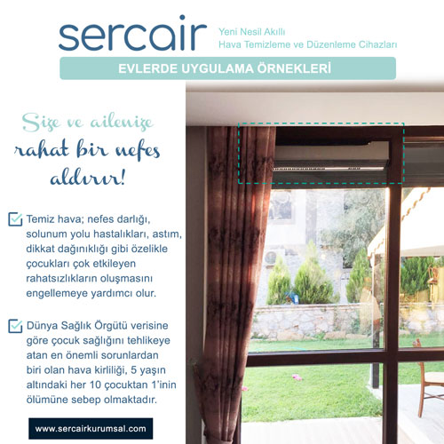 Sercair'in 7/24 süren otomatik hava temizleme işlemi sayesinde evinizin havası sürekli temiz kalır. Sıcaklık, nem, karbondioksit, VOCs (uçucu organik bileşikler), karbonmonoksit, PM ölçümü ve partikül miktarı analizlerini aynı anda yapan Sercair, temiz havayı filtreleyerek odanıza alır. Filtrelenmiş havayı UVC lamp ile sterilize eder ve bu havanın sıcaklığını ön ısıtma ünitesi ile ideal seviyeye getirir.
