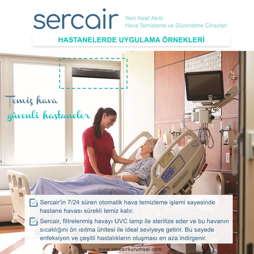 Sercair'in 7/24 süren otomatik hava temizleme işlemi sayesinde hastane havası sürekli temiz kalır. Sıcaklık, nem, karbondioksit, VOCs (uçucu organik bileşikler), karbonmonoksit, PM ölçümü ve partikül miktarı analizlerini aynı anda yapan Sercair, temiz havayı filtreleyerek hastane ortamına alır. Filtrelenmiş havayı UVC lamp ile sterilize eder ve bu havanın sıcaklığını ön ısıtma ünitesi ile ideal seviyeye getirir. Bu sayede enfeksiyon ve çeşitli hastalıkların oluşması en aza indirgenir.